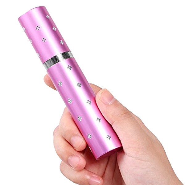 Un taser shocker électrique avec lampe torche LED qui allie puissance d'auto défense et féminité grande classe avec sa forme vaporisateur à parfum pour sac à main (ou bâton de maquillage) en métal brillant, rouge, bleu, rose ou noir.